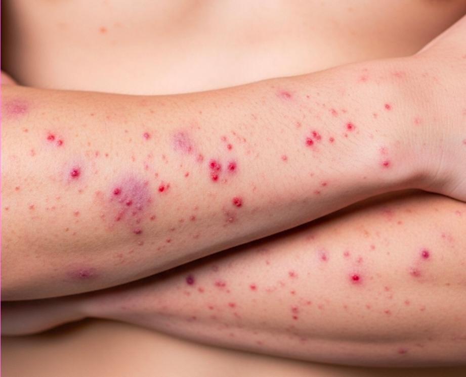 - Tiny brown, red, or purple dots known as petechiae are found beneath the skin. Their most frequent locations are the midsection, arms, legs, and buttocks.