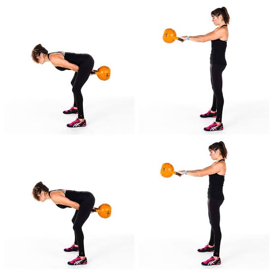 This exercise can be performed by standing with feet by being shoulder-width apart, hinge at the hips to swing a kettlebell back between your legs and then thrust the hips to the forward position to power the swing up to shoulder height. Perform 4 sets of 10–12 reps.
