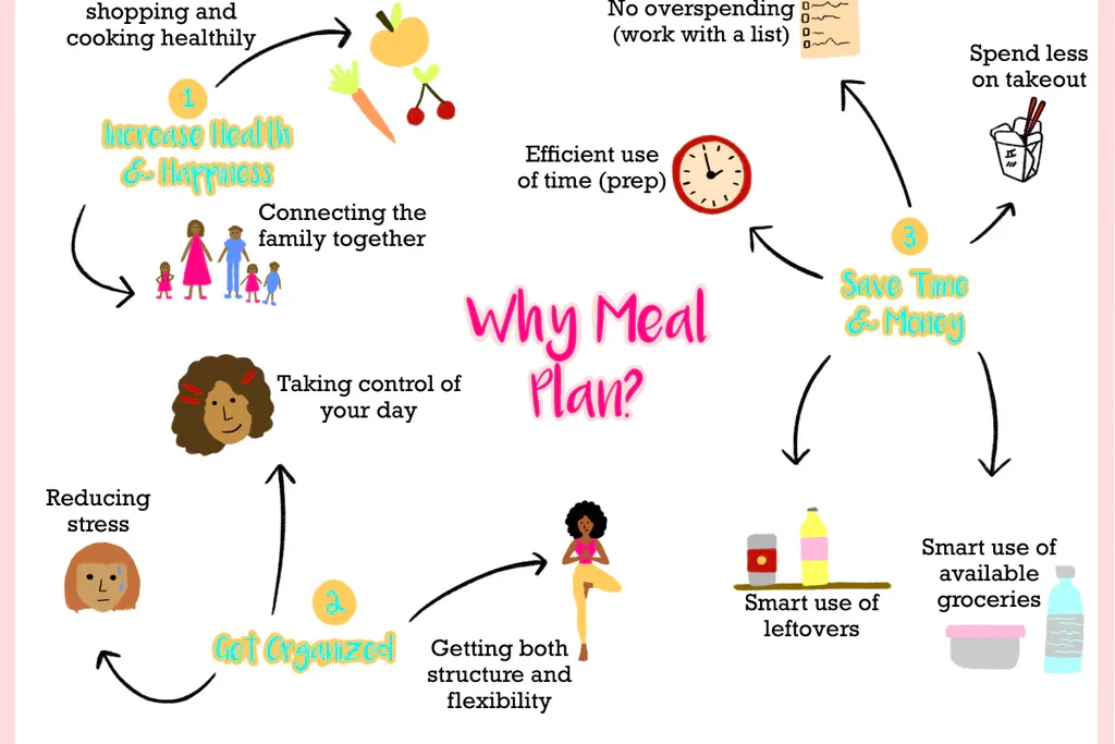Meal planning involves creating a weekly menu. It can reduce stress and save time during the week by getting rid of the decision-making around food.