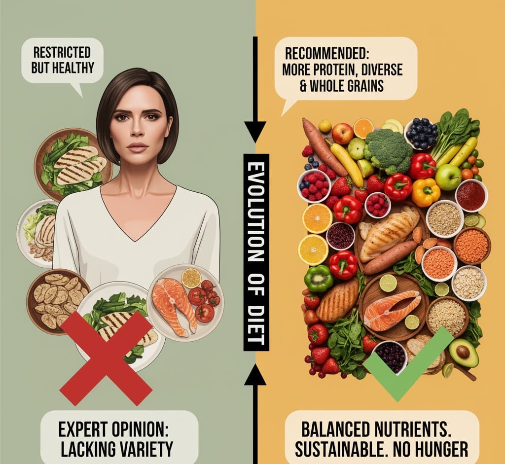 Victoria Beckham’s Diet is healthy but overly restricted and lacking dietary variety, they recommended increased protein, more diverse fruits and vegetables, and whole grains to ensure a balanced intake of nutrients. The diet’s potential to lead to hunger and its lack of sustainable variety are a concerning point for health professionals.